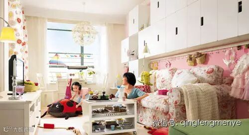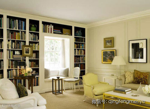飘窗两侧的墙面改造成整体收纳墙,收纳展示家中的各种藏书,再将飘窗改造成小小的坐卧区,这个飘窗区即刻变身飘满书香的读书角。