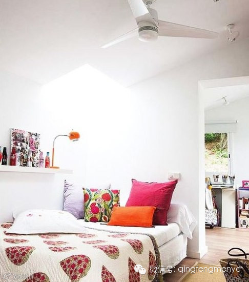 整个卧室以白色为主打色调,搭配花纹系被单与红色系抱枕,将整个卧室空间冷暖平衡化;不喜欢空调的朋友可以装一个吊扇灯,夏日里的凉风会特别清爽。