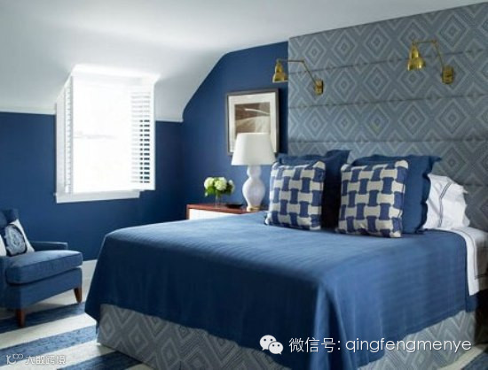 以深蓝为主,卧室彷如沉浸在一片蓝色的海洋里;床头柜上的两盏白色台灯犹如海洋上的明灯,恰如其分点缀着整个简单的卧室。