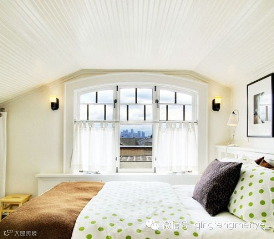 绿色波点床垫打破了纯白的宁静,给简单卧室点缀出亮丽活跃的色彩;还有那一面大大的飘窗,搭配两侧小小散发柔和灯光的壁灯,睡觉应该会很舒心吧!