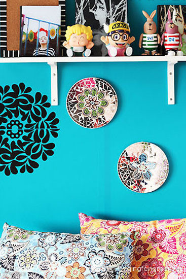 简单几块隔板组合成了一个实用的置物架,将各类小物品收拾得妥妥当当,既利用了空置的墙面空间,又起着美观墙面的作用。