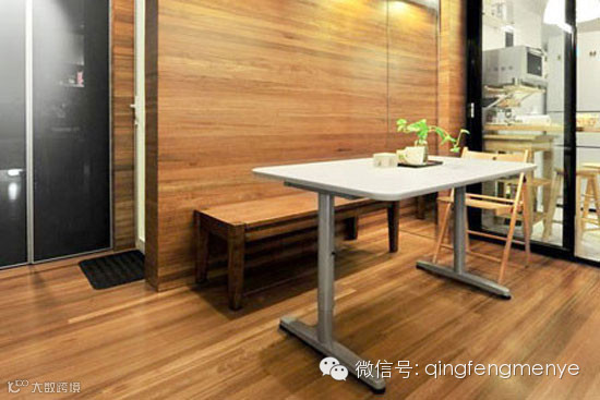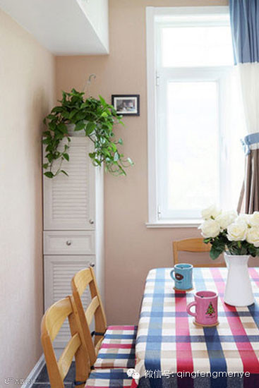 利用窄长型的百叶门收纳柜放置在餐桌边的角落里,节省了空间的同时,也让餐厅变得开阔。