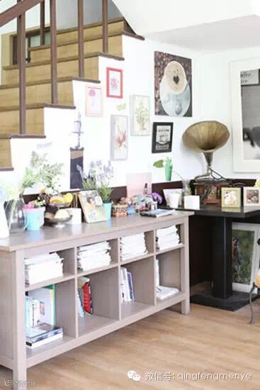 楼梯旁通常是最为尴尬,最难以利用的地方,可一个扁长的收纳柜便能很好地解决这个难题,收纳柜搭配相框,将狭小空间装饰得美不胜收。