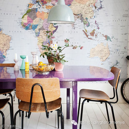 不喜欢粉嫩的布艺软装?豪爽的妹子们不妨换个颜色来调氛围,将低调的奢华进行到底,比如选用不常见的紫色餐桌就是非常有个性的选择。此时,再用一张一体大壁纸做墙面装饰,就可以轻松打造出一个简单利落的小餐厅。但需要注意的是,壁纸一定要选择比较浅淡的色调,这样才能与桌面颜色相呼应。