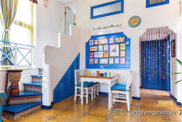 地中海风格的灵魂,是“蔚蓝的浪漫情愫,海天一色,艳阳高照的纯美自然”。设计师通过空间改造,配饰搭配,色彩运动等方式,营造出一个浪漫,神秘,清新的居室环境。白色与蓝色的交相搭配,将阳光海滩的浪漫带回家!