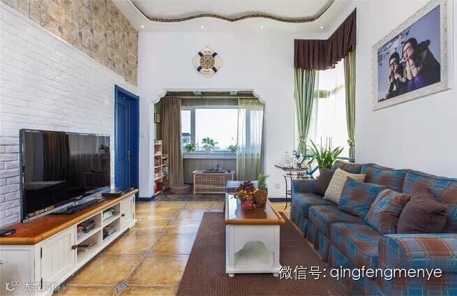 复古的白色砖墙和蓝色木门带来浓浓的浪漫气息,蓝棕格子布艺沙发复古且慵懒,舵轮与时钟相结合,突出海洋的情结。