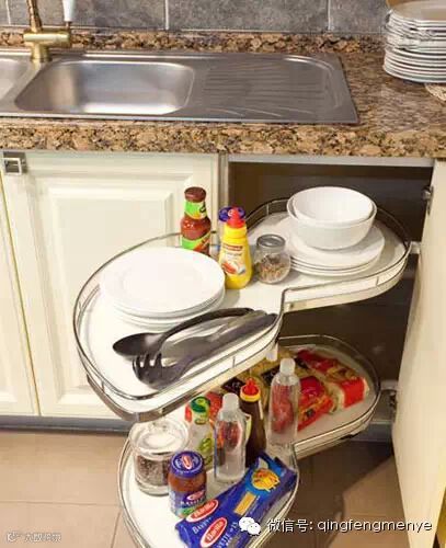 橱柜中的多层设计可以方便常用物品的收纳,这样的转角层架,能很好地利用转角空间,转盘式设计也方便使用,L型、U型橱柜都可以考虑有这样的一个层架哦。