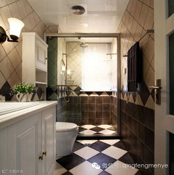 划分干湿区域 安装淋浴房,做出空间干湿分离。地面和墙体的瓷砖铺贴选择既跳跃又协调的拼花方式,色调也以黑白黄为主。洗手柜提供了收纳空间。