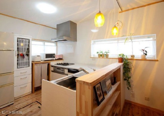 小空间木色的厨房让厨房更具自然风味。这款装饰中,水池台的后侧,木板打造的收纳柜,分层摆放上一些小物品,犹如一个小展架,放上一家三口的照片,浪漫温馨无法阻挡。木色的地板,清晰可见的木质纹理,将自然之风吹满整个厨房区域。白色的存碗柜,抽屉的样式,将常用的碗盘放在上面,便于拿取,将不常用的放在下面的抽屉里,可以避免沾灰,非常实用。再搭配一个半透明的小帘子,又透出一丝神秘的气息,非常实用。