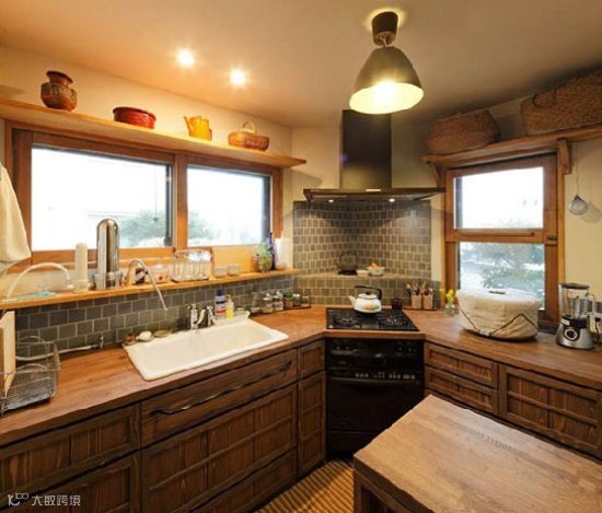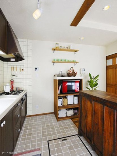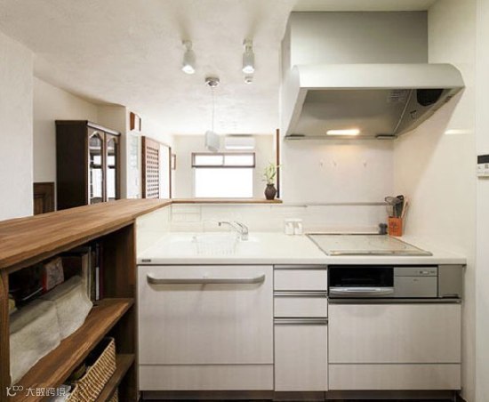 木色与白色是日式装饰中不可缺少的色彩,当然这种色彩也不会缺席厨房的装饰中。各种厨房工具,悬挂在墙壁上,整洁大方。白色的水壶,搭配乳白色马赛克墙壁,色彩协调统一的同时,又与黑色的炉台形成鲜明的色彩对比,黑白搭配,干净整洁。木板打造的收纳空间,存放各种现代厨房用品。而竹篮小筐,搭配一块小布,增添了田园气息。大小不同,绿色,透明的杯子,又增添了厨房的动感,让厨房也充满生机。而原木色彩的柜子,圆润的色彩,吹来了淡淡的历史之风,淳朴的日式淡雅之情弥漫整个空间。