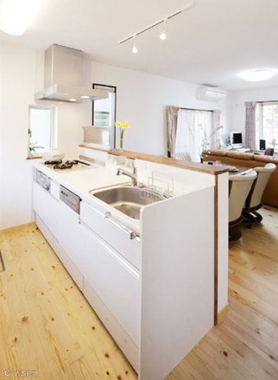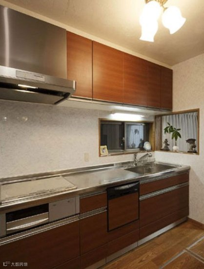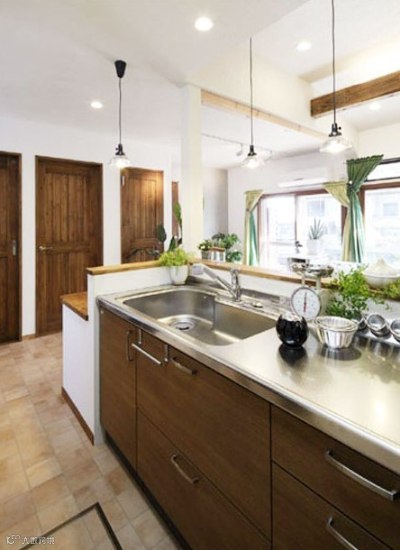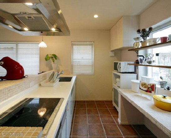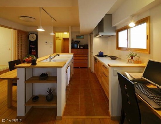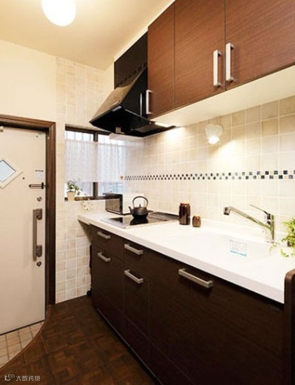 深木色与米色完美融合,也可以将厨房区域装饰的更具日式风情。这款装饰中,木色的地板,深浅不一的色彩搭配,让厨房更加亲近自然。木色的整体橱柜,搭配白色的厨台,古朴的日式色彩将厨房装饰的更加靓丽。淡淡的大理石色彩的马赛克打造的厨房墙壁,与水池台自然的色彩过渡,中间的一条黑色与棕色马赛克拼凑而成的小装饰,给厨房增添了活泼可爱的气息。窗口上白色带暗花图案的小窗帘,不仅可以遮挡灰尘,而且将厨房装饰的更加悠然恬淡。