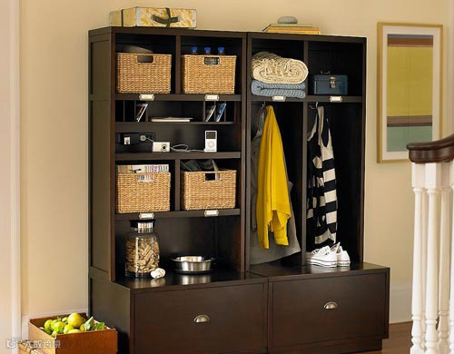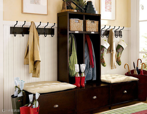 这款玄关柜的上层可以作为帽子、围巾,下层可以作为鞋柜。在上层吊柜的下端装一排挂钩,还能挂衣帽,而鞋柜同事可以作为换鞋凳,简单又实用。