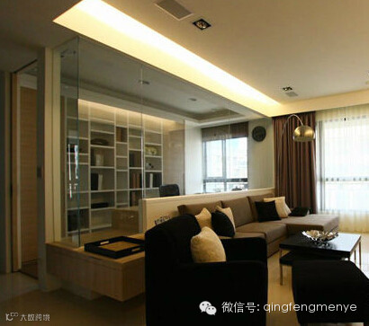 分隔客厅功能区域的隔断种类多样,而简单的玻璃隔断,在起到区域划分作用的同时也不影响室内的整体的视线,打造出室内通透的感受。