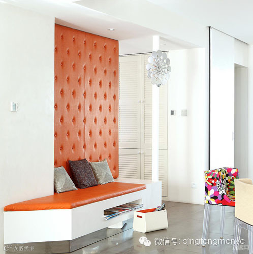 想要让你家玄关更耀眼,可以用一些鲜艳的色调来妆点玄关,比如这个玄关,设计师使用了非常眨眼的橘黄色,皮质感的沙发和背景墙,让这个空间变得时尚又高贵。