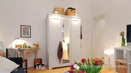 客厅的旁边放置了大件衣柜,在其侧边还钉上挂钩增加了部分随性的收纳空间。电视柜没有选择低矮的造型,这样的高度在小空间可以存放更多杂物,并结合收纳箱高效解决储物问题。
