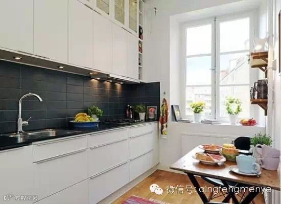 狭长型小厨房,厨房内置餐厅的装修,最适合一字型橱柜来一展身手了。简易的小吧台设计在角落里,很适合浪漫两人行。白色的橱柜和黑色的地砖在色彩上形成了很大的对比,和全白色比起来,这样的设计明显视觉感更强。