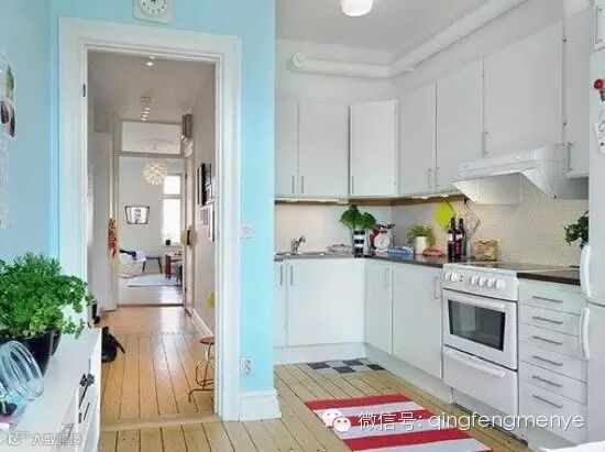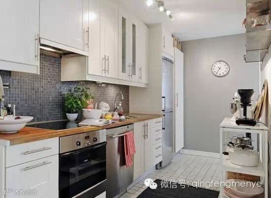 高低有序的吊柜给中规中矩的北欧式厨房中带来了一些层次感。白色瓷砖地面上铺就的黑色地毯是非常不错的色彩对比。狭长的户型就该采用这样的一字型橱柜。