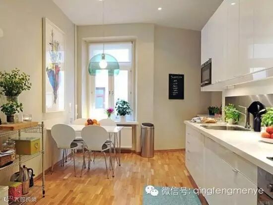 这个厨房空间有那么点不规则,内部明显多出了一个小角落,正好用来放上一个精致的收纳柜或者干脆让橱柜延伸出去,设计成一个小吧台。餐桌放在了光线较好的窗边,加上灯光的点缀,和温馨。