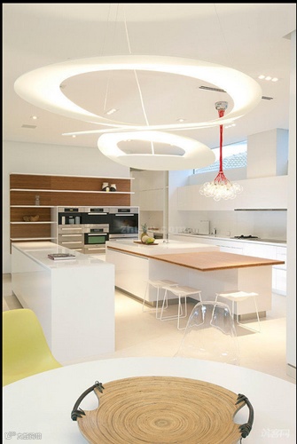 个性很足的一款设计,主要体现在上部空间的艺术化,两个大小不同的白色椭圆形,配上别样的灯,足以让这间厨房与众不同。