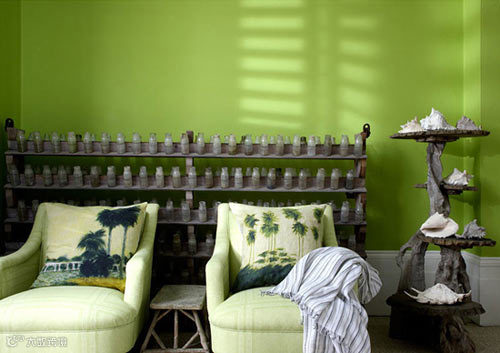 编辑点评:古老的树干支架为客厅创造了工艺品展示平台,与沙发后面放满瓶子的支架一起为客厅营造出原始复古风味,客厅角落俨然成为一个“收藏阁”。绿色的背景墙与浅色沙发和谐搭配,让客厅充满清新自然的味道。