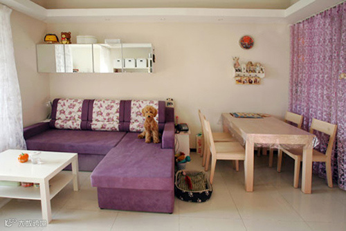 搭配tips:紫色转角沙发宽大舒适,可最让吃货们兴奋的却是墙壁上的白色收纳柜和可以容纳大量美食的茶几,吃货们可是时时刻刻都想着吃呢。