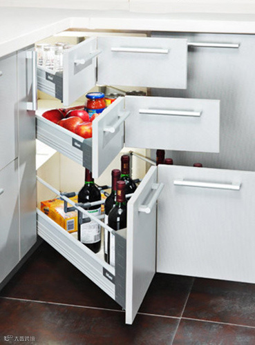 搭配tips:L型设计的拉篮将有限的储物空间最大化,三层大小排列柜,依据食品不同的大小高度依次储存,绝不浪费一处可利用的空间。