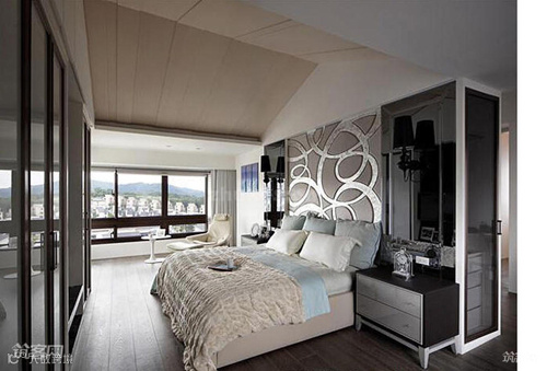 【别墅卧室装修效果图】宽敞开阔的空间给人闲适放松的感觉,配色上依然延续淡雅的风尚。背景墙上的曲线很有表现力。追求舒适与高品质,一点点点缀足矣。