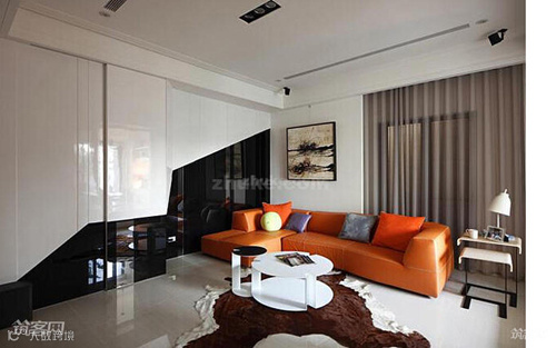 【别墅客厅装修效果图】看多了淡雅的配色难免会厌倦,一抹橙色印入眼帘让人惊喜。抱枕也搭配了不同的颜色和形状,在细节之处满足了想象力的蔓延。黑白的经典配色依然延续,只是拼色的设计更加独特。