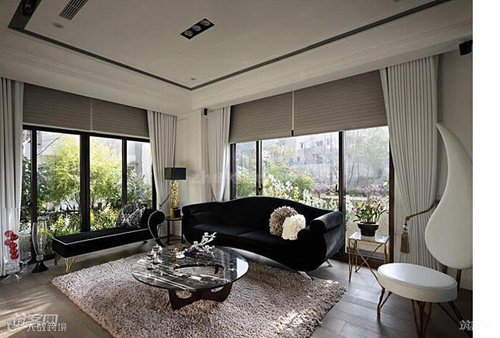 【别墅客厅装修效果图】大面积的窗户带来通透的采光,然而也不用担心光线过于强烈,可收缩的窗帘是很贴心的设计。淡雅的配色给人干净明朗的印象,而大面积的绒毛地毯则彰显质感。