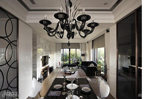 【别墅餐厅装修效果图】黑与白的经典配色让人百看不厌,在简约淡雅的基础之上,造型各异的餐椅带来了恰到好处的设计感,让整个氛围生动起来。墙面变幻的圆圈纹路,传达出对时尚的敏锐度。