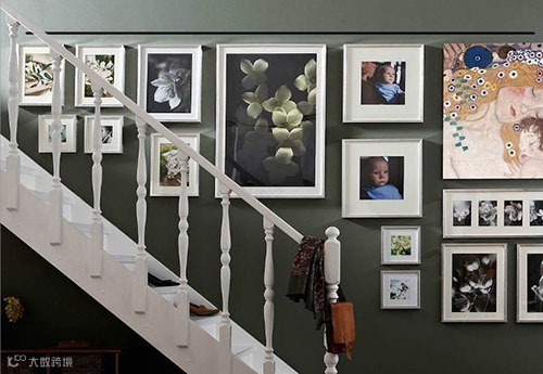 在楼梯间悬挂画框,可以把把家里无趣的空间制造出一种置身美术馆的错觉。也可以在家的任何墙面顶线划一条直线,以此整理悬挂好一组组画框。