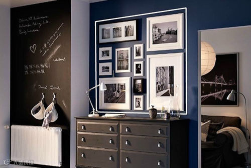 在墙面空间的底线划一条直线,在这之上组合和布置大量画框作品。注意,要以底线为界,向上和向两边铺张开来。