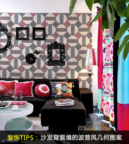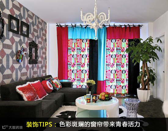 装饰TIPS:黑色的深沉沙发,不规则几何图形的沙发背景墙让客厅显得大气又沉稳。色彩斑斓的窗帘给沉稳的客厅带来青春活力。
