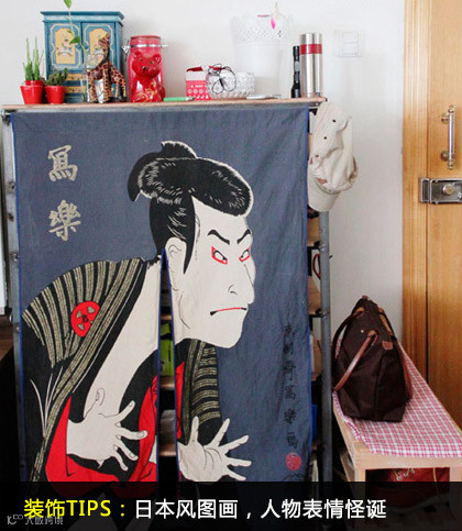 装饰TIPS:橱柜的遮挡帘用的是日本风图画,人物表情怪诞,加上图画比较大,效果十分突出。如果你有一些特别的喜好,将之展现出来就会显得很有个性。