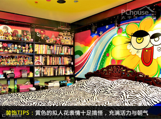装饰TIPS:床头一整面的卡通壁画,亮丽的颜色非常抢眼。黄色的拟人花表情十足搞怪,充满活力与朝气。这样一幅壁画就能够为你的卧室大大加分,告别平庸。