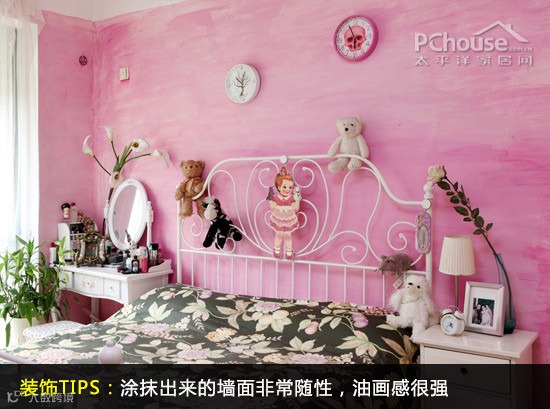 装饰TIPS:粉红色的墙壁并不出奇,但采用油画的涂抹手法,便使得墙壁个性十足。涂抹出来的墙面非常随性,油画感很强,令人仿佛置身于童话世界。