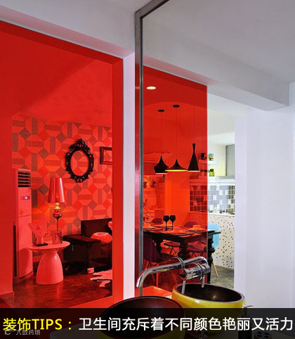 装饰TIPS:卫生间的隔板用的是大红色的透明玻璃,狂野又有情趣。