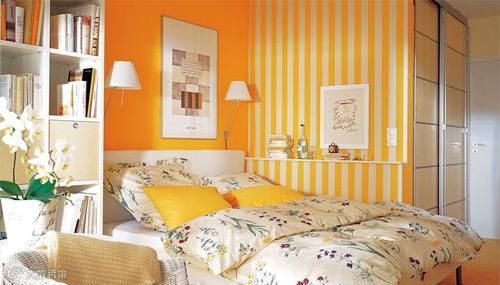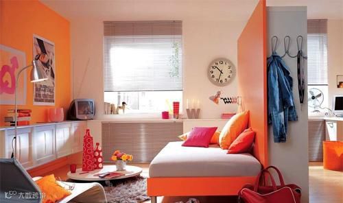 橙红色的房间很温暖,还会像牛奶软糖一样散发出淡淡的甜味。带有圆圈和斑点的装饰瓶,很欧式风情的茶几收纳架,百叶帘,都为房间演绎出了活力和甜美。