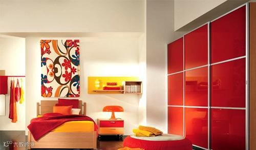 红色的推拉式大衣柜,几何图案的墙面装饰画和床头柜上方的搁板,巧妙地将整个空间分割成一个个独立的区域。卧室的风格和层次都很分明,充满了年轻的动感,就像巧克力一样,细腻温暖醇美。