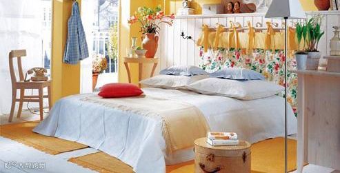 在原本普通的床头钉上一根帘杆,系上漂亮的明黄色蝴蝶结和碎花棉布,与黄色的墙体相呼应,是属于花生糖的甜美。