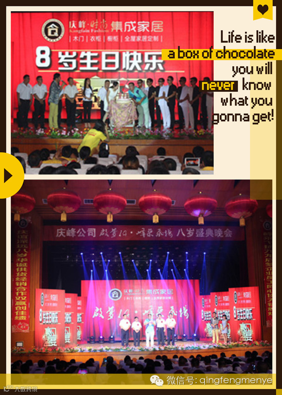 最后,8月8日晚政界领导、各地经销商和庆峰公司全体员工齐聚寿阳县宣传文化中心举行了庆峰公司8岁生日大型庆典、颁奖晚会,晚会以“唱响庆峰,感动八年”、“运筹帷幄、筹备起航”和“开拓进取、圆梦庆峰”三个篇章进行,庆峰品牌代言人桐溪、著名歌手谢东倾情演绎,庆峰员工自编自导的团队展示更是把晚会现场推向了高潮,全场观众为之震撼,最后,晚会在歌曲《明天会更好》的祝福中落幕。
