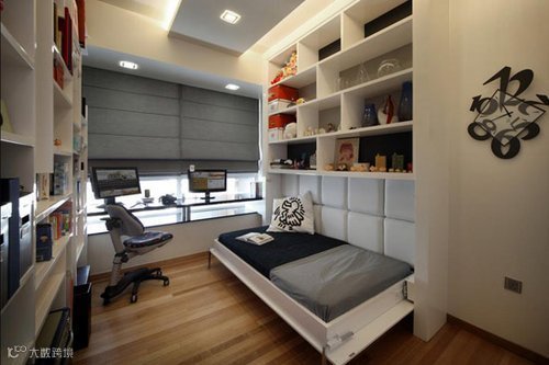 装饰TIPS:在这里,把睡床收起来,卧室就变成一个书房,是典型的工作空间以及睡眠空间二合为一的的搭配,使这两个空间能轻易地相互转换,最大限度地节省空间,毫不影响任何一个空间的单独使用。
