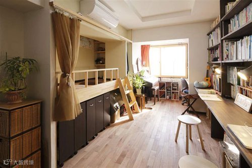 装饰Tips:安装支柱、提升高度的榻榻米形成了相对独立的空间,把下方的空间放置收纳柜,提高空间使用率。错落的视觉效果,倍感新鲜。镂花的拉门装了滑轮,收起来的时候可以和衣柜成一条直线,具有极高的隐藏和装饰效果。