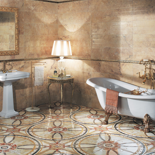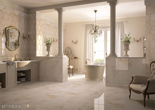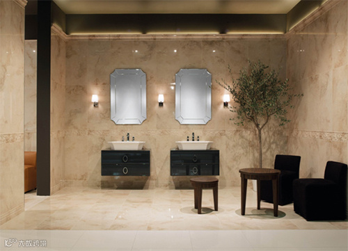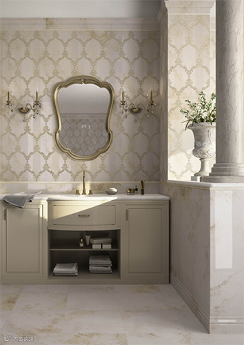 曲线柔美的金色镜饰、做工细腻考究的壁灯用卓越的品质彰显欧式优雅的魅力,金色印花的墙砖则显得格外贵气。