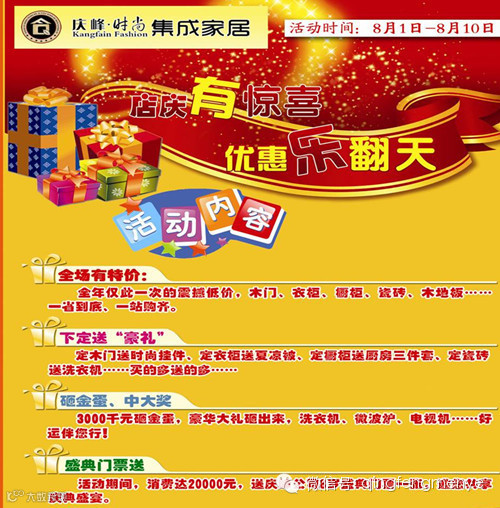 家,是每个人的避风港;家,是每个人的心灵寄托处;家,让每个人找到温暖的感觉。然而,能给你避风和温暖的家同时也是需要你精心呵护的,为了让你的爱家变得更加温馨美丽,快来参加庆峰的特惠盛典吧!
