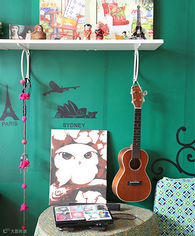 装饰TIPS:不妨用多余边角料自己DIY浪漫的花卉吊饰,搭配最具音乐嬉皮精神的吉他,装饰单调的搁架。
