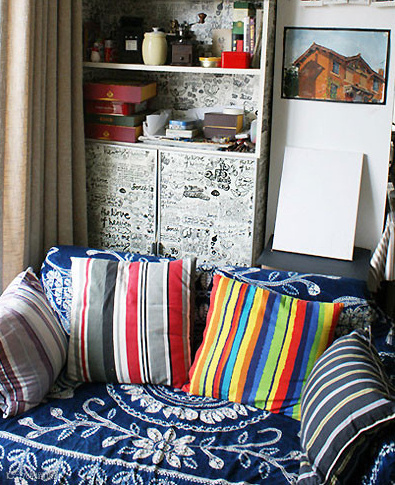装饰TIPS:闷骚质朴的蓝色扎染民族印花,搭配色彩艳丽的条纹抱枕,激发更明朗洒脱的想象。