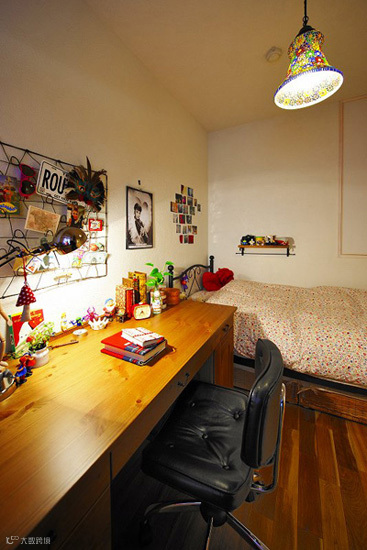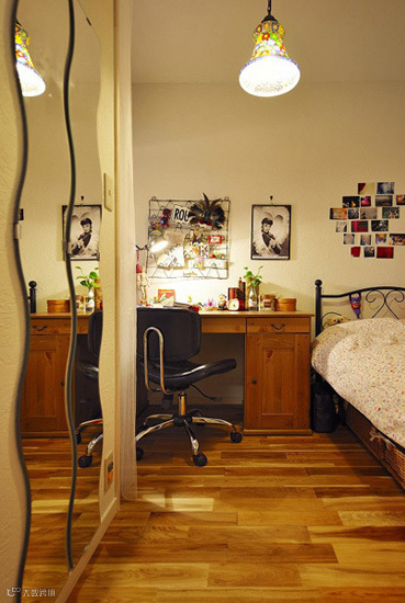 装饰Tips:儿童房的地板用了纯天然的松木材料,非常有益于身心健康。碎花灯罩的小吊灯,田园风格浓厚。木质的书桌,清晰的木质纹理,自然风浓郁。