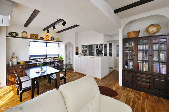 装饰Tips:纹理清晰的木质地板,放佛记载着主人生活的点点滴滴。复古风格的玻璃门书柜,厚实的木材质感,沉稳大气。白色的沙发,简约却不失素雅。