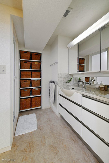 装饰Tips:滕编的箱子,清新淡雅,显得别具一格。圆弧形的洗脸盆,样式小巧,柔和了整个空间。长方形的洗漱镜,起到了扩大空间的视觉效果。